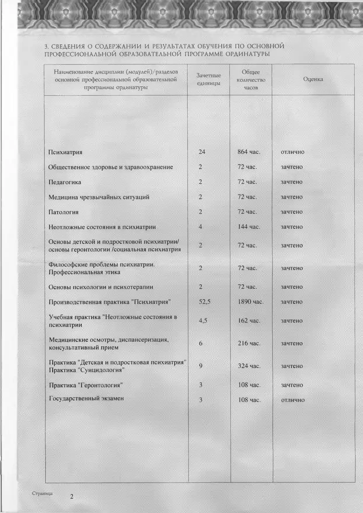 Клиническая ординатура по специальности "психиатрия" в НМИЦПиН им. В.П. Сербского. Основная база - ПКБ 1 им. Н.А. Алексеева.