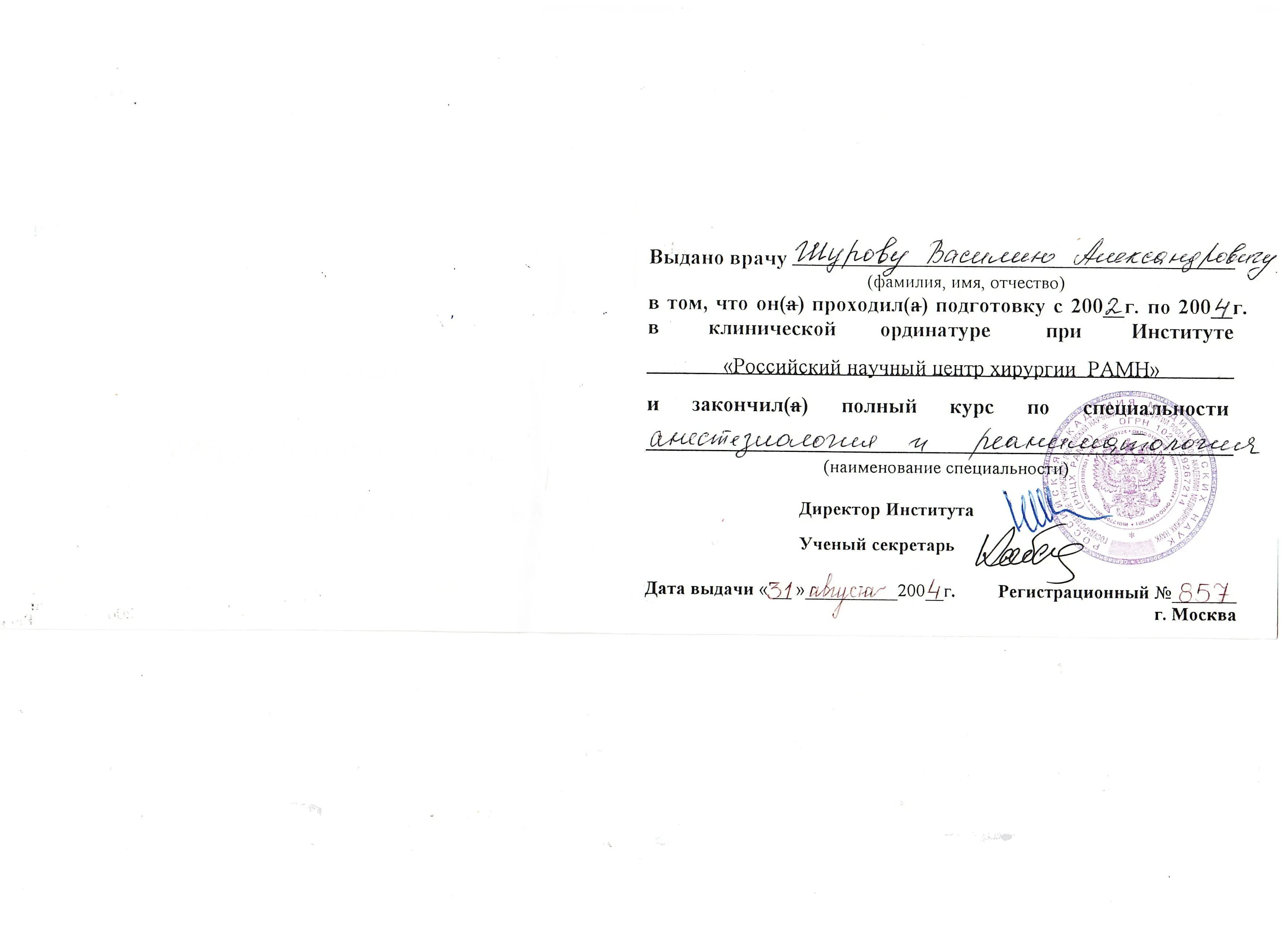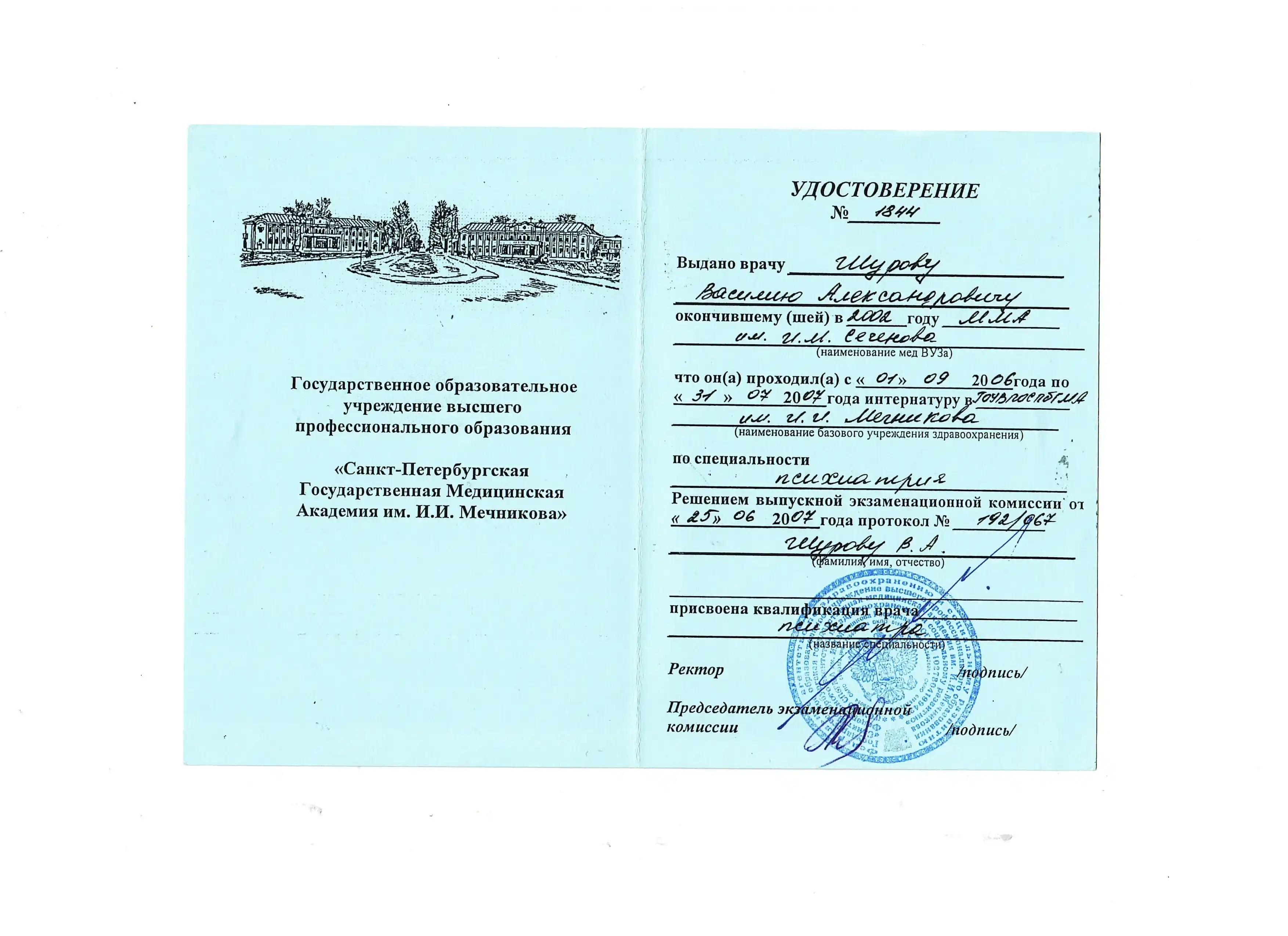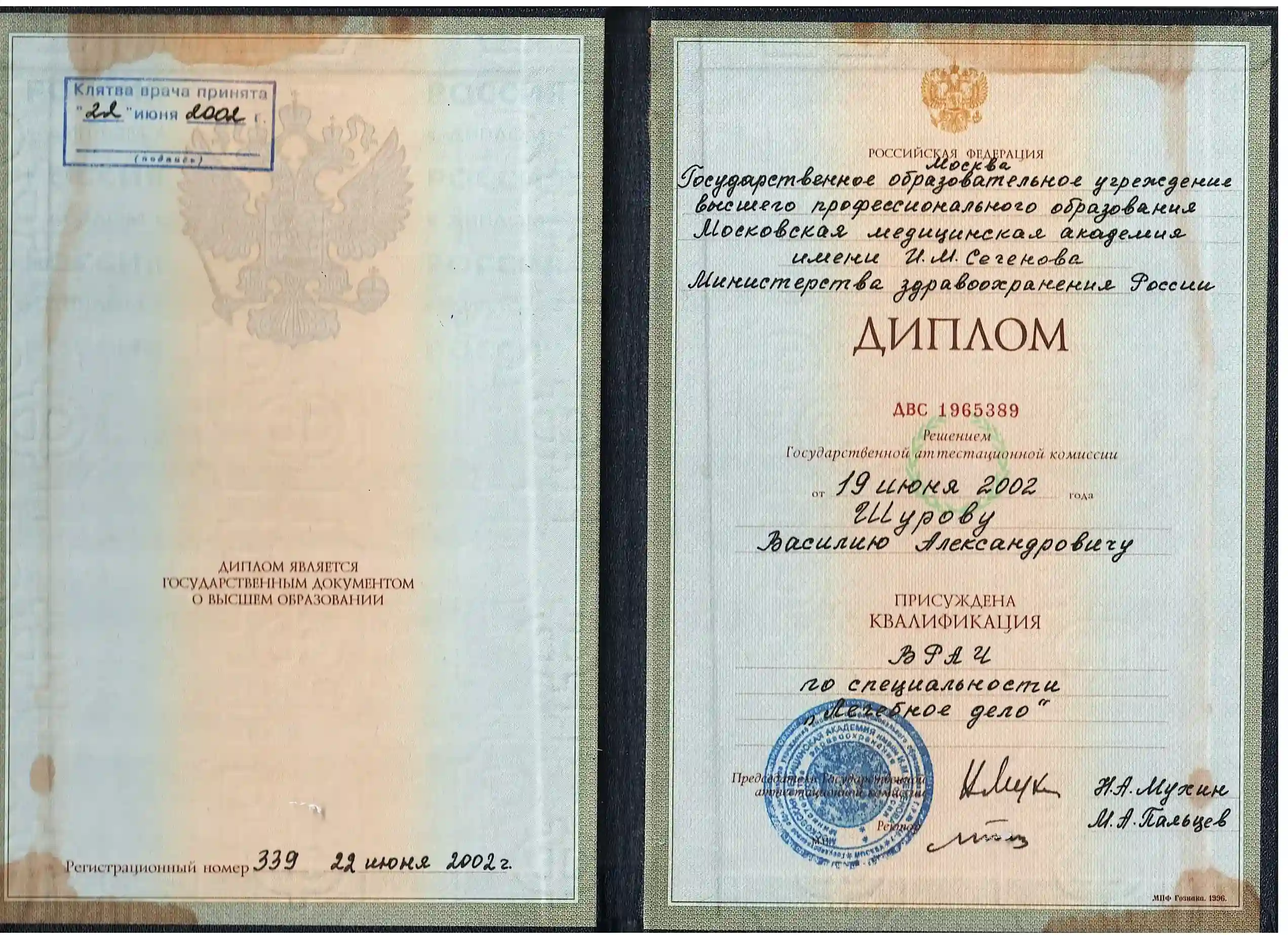 Диплом по специальности "Лечебное дело", Первый Московский государственный медицинский университет имени И. М. Сеченова